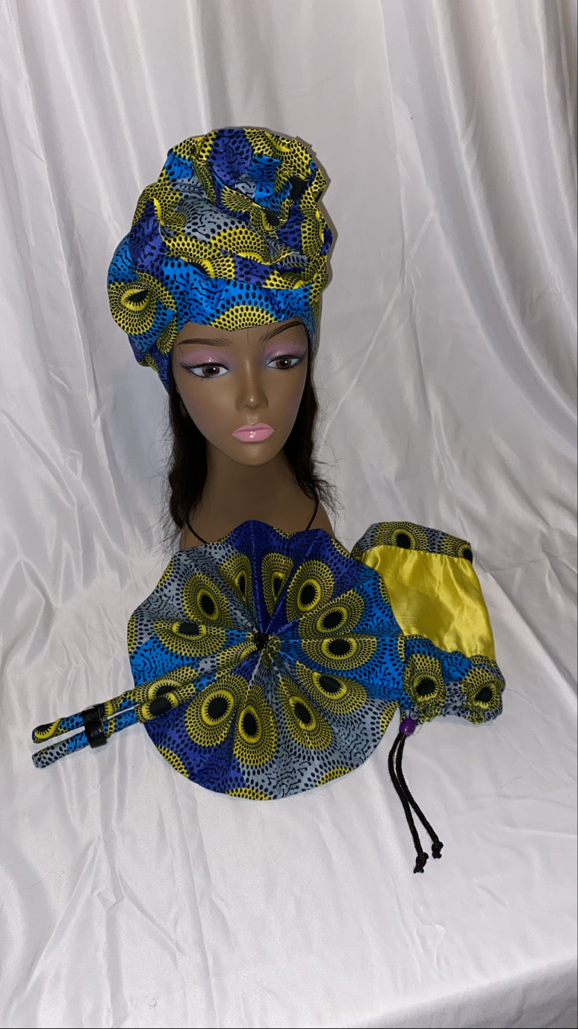 Stay cool and pretty with this set, comes with matching hand fan, stylish head cap and storage bag.